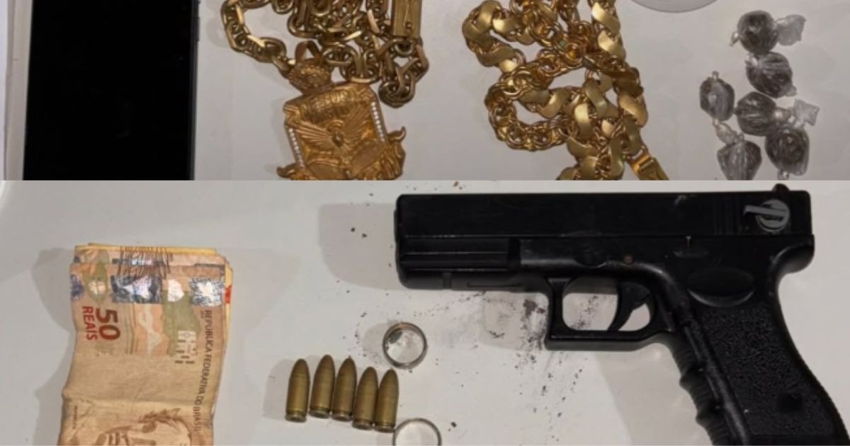 Foi dada a voz de abordagem. Na busca pessoal, os militares encontraram 7 pedras de crack, 13 “petecas” de cocaína, 6 buchas de maconha, 1 simulacro de pistola, 5 munições 9 mm intactas, R$ 210 em cédulas e 1 celular Samsung.