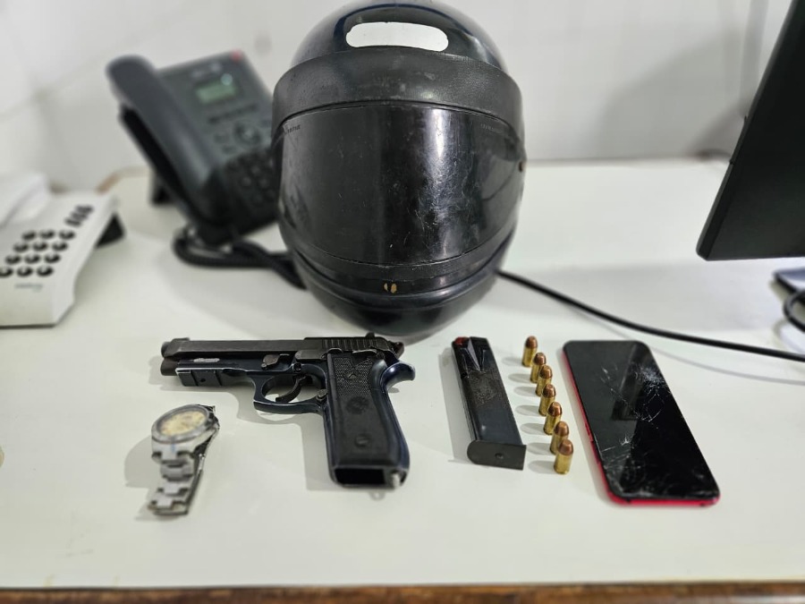 O suspeito conduzia uma Honda CG 125 preta, sem placa. Na revista, os policiais encontraram uma pistola .40, modelo PT 100, com numeração suprimida, além de carregador e sete munições. A motocicleta apresentava chassi e motor raspados.